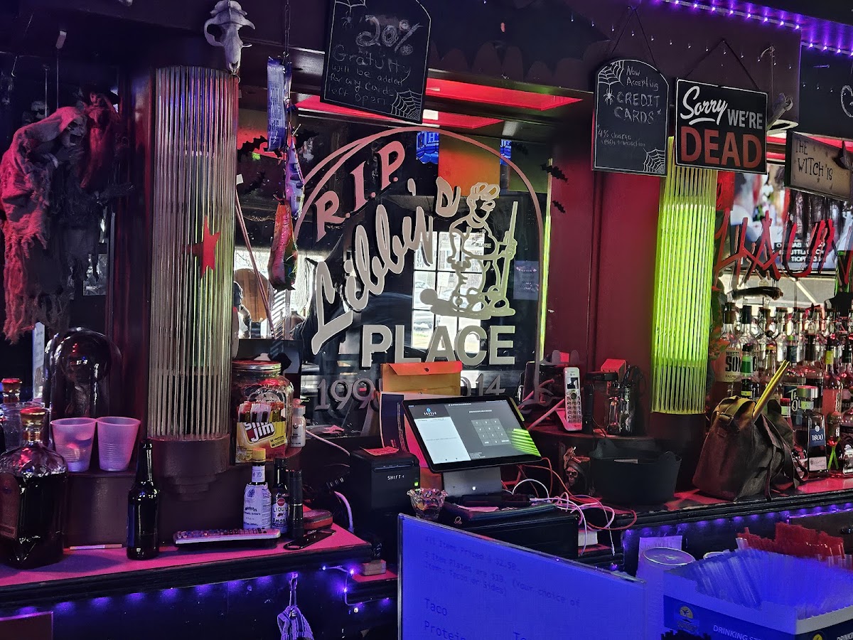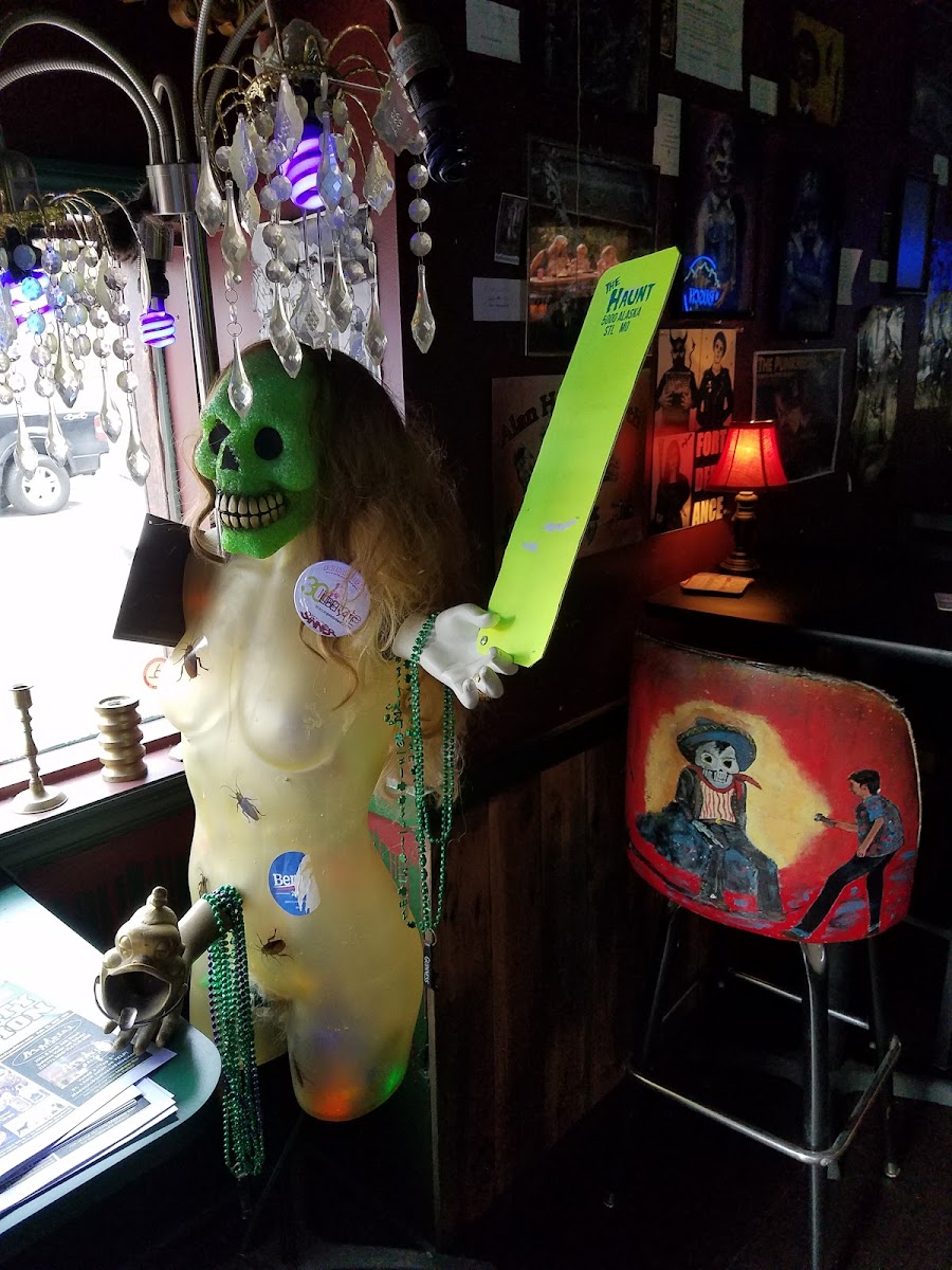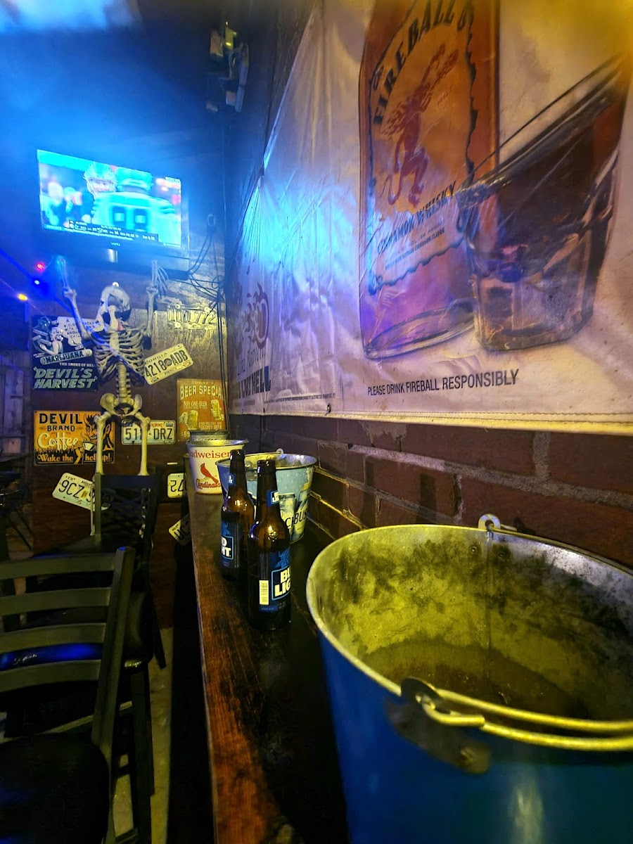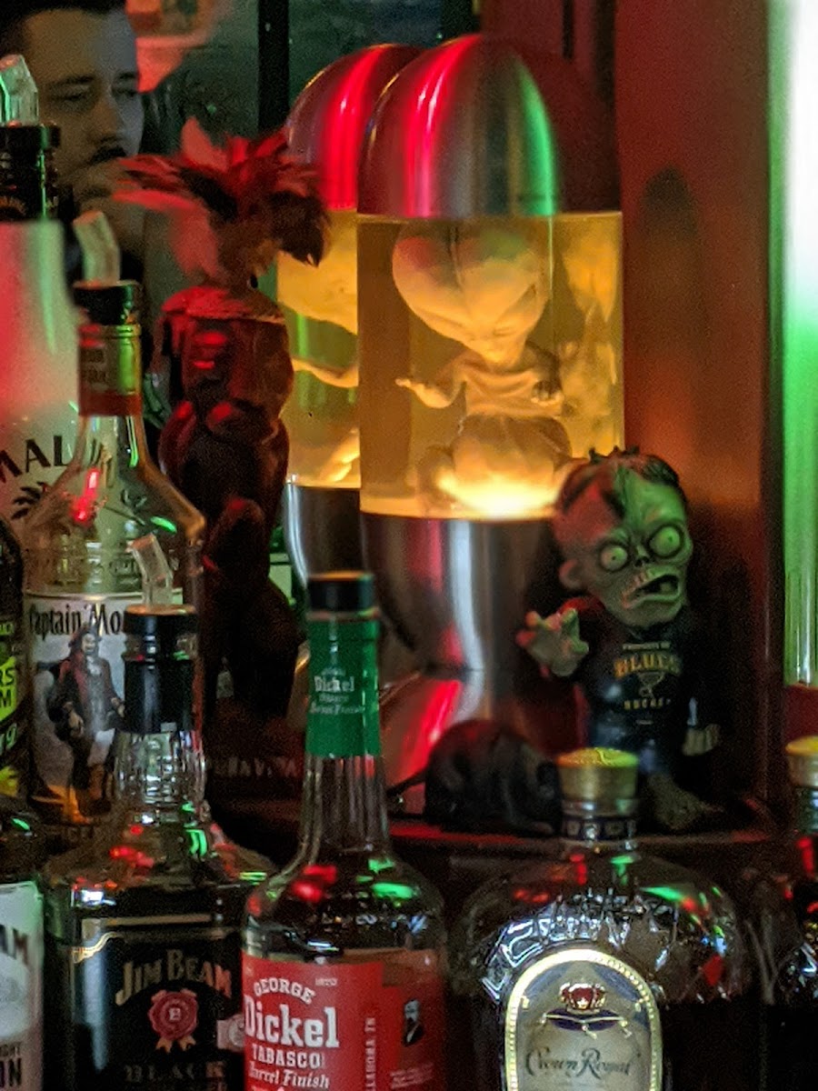 Halloween themed Hole in the wall. Cash only, Cheap, One Pool Table, Covered outdoor area, Tables on the back patio. Laid back, macabre atmosphere, dark lighting. Good for grabbing a couple of beers with friends, a 1st date, or spending the night with strangers. Many people that come here live in walking distance or a short drive away.